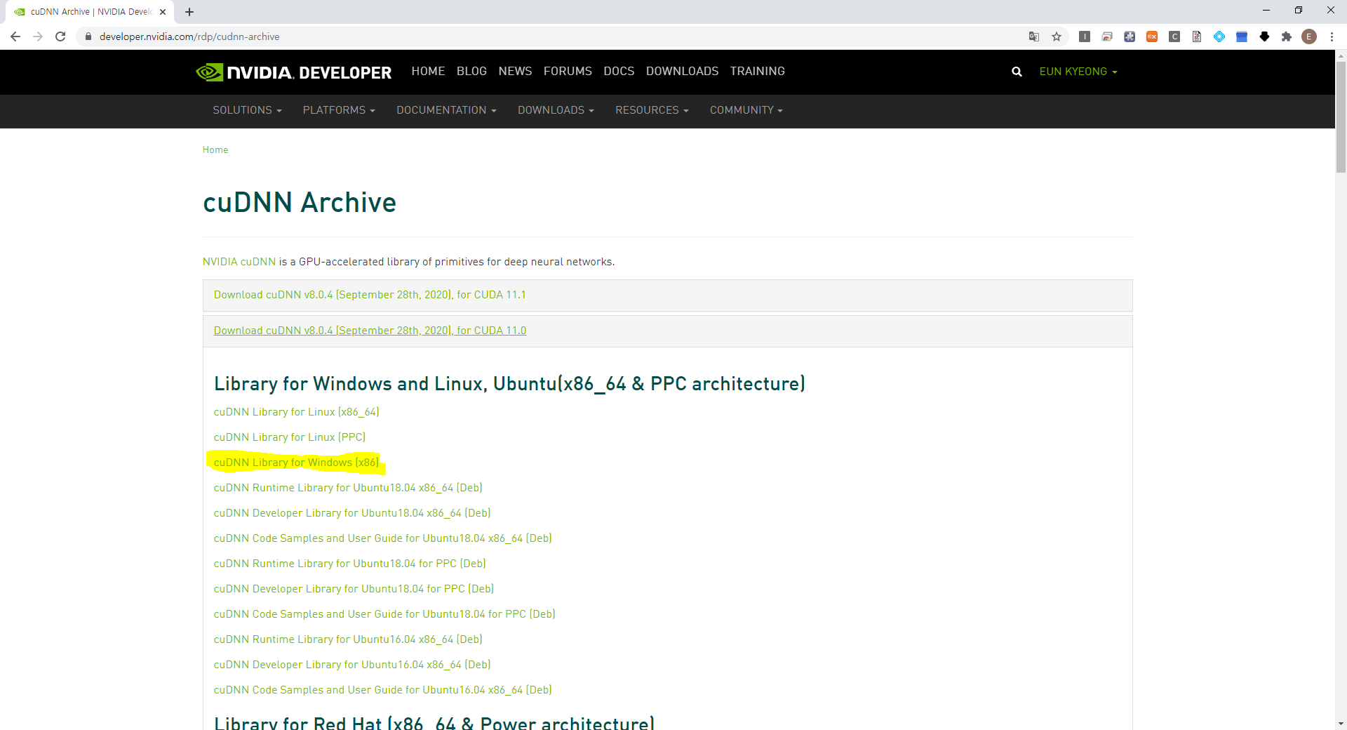 로그인 하시면 이렇게 버전을 확인하실 수 있는데, 위에서 cuda 를 11.0 으로 설치했으므로 cuDNN 도 Download cuDNN v8.0.4 (September 28th, 2020), for CUDA 11.0 버전을 다운받았습니다.